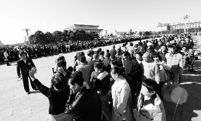 图为毛主席纪念堂开放首日一大早,门前便排起了长队