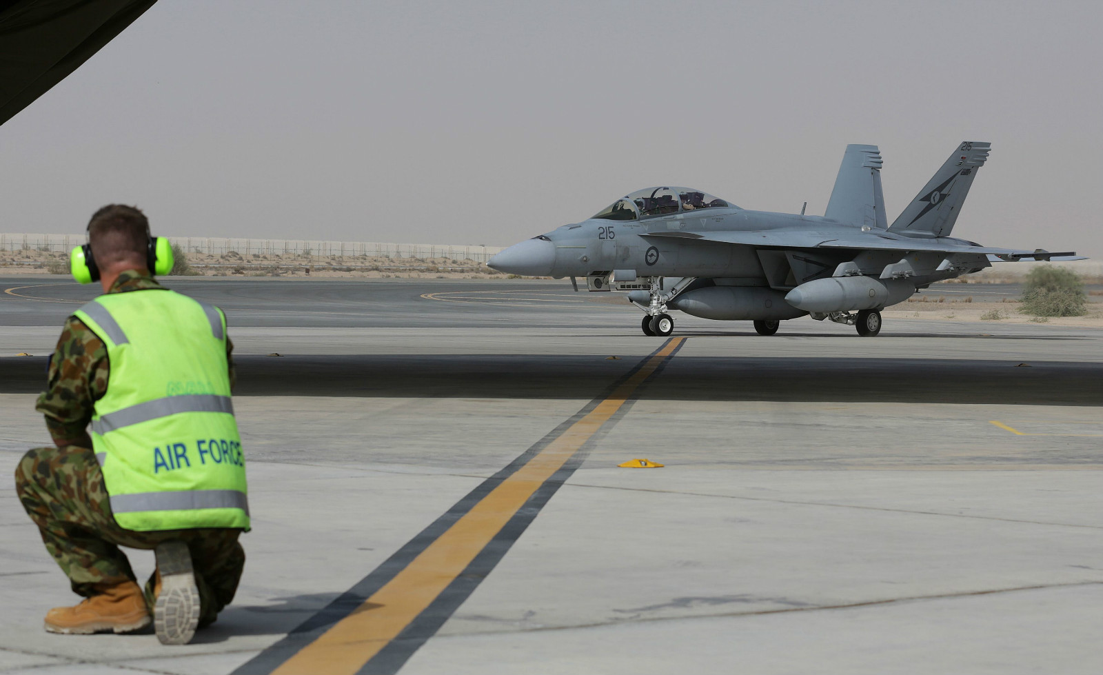 一架澳空军F/A-18F“超级大黄蜂”战斗机降落在中东的军事基地。