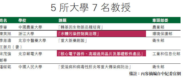 姓名学校课题牵头部委李宁中国农业大学「转基因生物新品种培育」农业部陈英旭浙江大学「水体污染控制与治理」环境保护部李澎涛北京中医药大学「重大新药创制」卫生部王新月(妻)宋茂强北京邮电大学「核心电子器件、高端通用晶片及基础软件产品」工业和信息化部邹华潘绥铭中国人民大学「爱滋病和病毒性肝炎等重大传染病防治」卫生部备注:内容摘编自中纪委官网