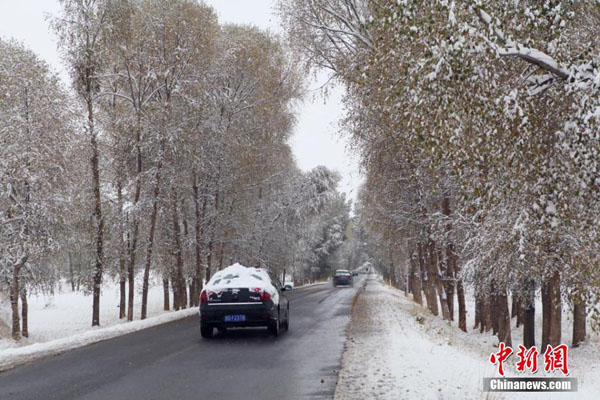 10月11日,兰州飘雪,夏日绿色、秋日黄色、冬日雪白色汇聚起来,让沉浸于“童话世界”的兰州年轻人直呼惊喜。来自气象部门的消息称,甘肃张掖、金昌、武威、兰州、甘南、临夏、天水等地连日来出现降雪。 杨艳敏 摄