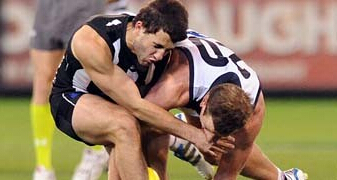 所谓的“抱摔”是指澳大利亚式橄榄球中的一种咄咄逼人的正面冲刺动作,目的是把对方球员放倒。