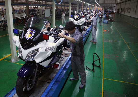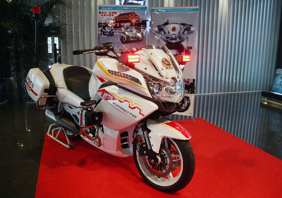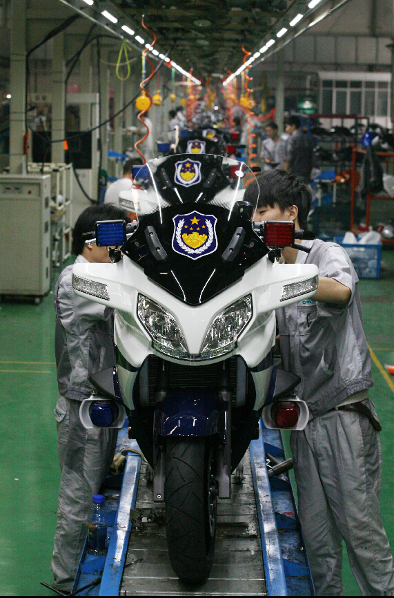 10月23日,记者探访位于浙江省杭州市余杭区的摩托车研发生产厂家,近距离接触国宾护卫摩托车。10月21日,坦桑尼亚总统基奎特抵达北京,开始对中国进行国事访问。从首都机场前往钓鱼台国宾馆的国宾车队中,出现了摩托车护卫队。这些新款国宾摩托车是杭州余杭自主研发完成的国产摩托,是国内第一款装ABS防抱死制动系统和全车LED灯的摩托,最高车速170公里/小时,可以紧急停车并完成180°的转弯。摩托车拥有650CC排量,在零下20℃低温环境下能一次性发动。最特别的是,车身设计上融入了许多中国元素,比如灵感来源于天安门的石狮像,流线型的长城图案等。图为厂家展厅内的国宾护卫摩托车吸引参观者。