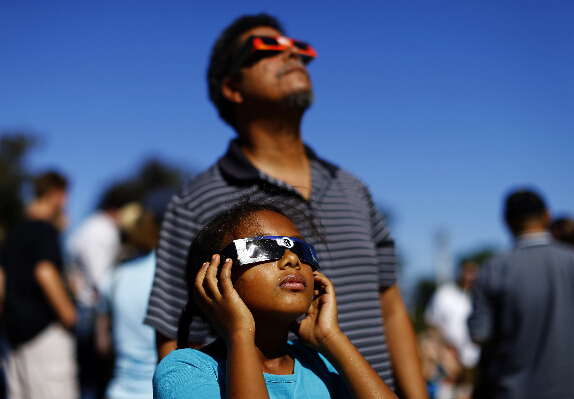 10月23日,在美国圣迭戈,人们观看日偏食。