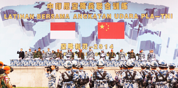 10月27日,經中央軍委批準,中國空軍空降兵與印度尼西亞空軍空降兵 “空降利刃-2014”聯合反恐訓練,在中國境內開始舉行。這是繼2013年中印尼空降兵在印尼境內首次成功舉行聯合訓練后,中國軍方與印尼特種部隊在戰術層面開展的又一次務實交流活動。圖為中印尼空降兵聯合反恐訓練開訓儀式。