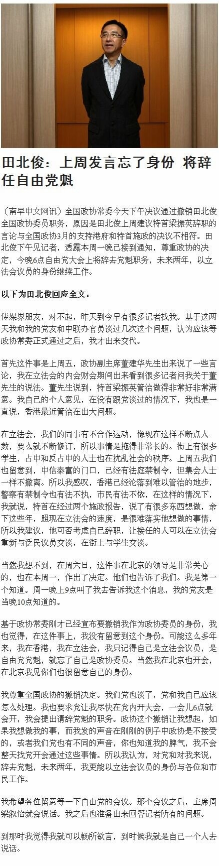 自由黨黨魁,立法會議員田北俊針對被全國政協撤銷政協委員職務一事在今日下午回應傳媒,他表示,對特首梁振英進行發言時并未考慮自己的政協委員身份,并表示,他將請辭自由黨黨魁職務。