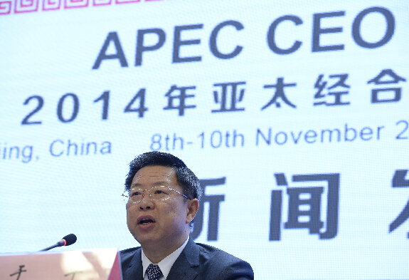 10月30日,中國國際貿易促進委員會在北京舉行新聞發布會,中國貿促會副會長、2014年APEC工商領導人峰會組委會副主席于平介紹了本次工商領導人峰會的籌備工作和前景展望。中新社發 侯宇 攝