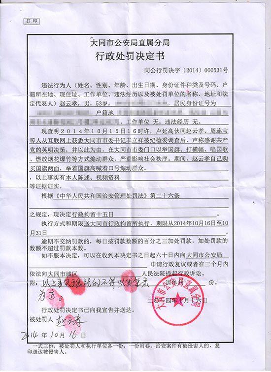 大同公安機關給趙云孝出具的行政處罰決定書。趙云孝供圖