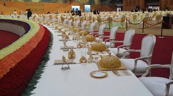 11月10日晚,習近平主席和夫人彭麗媛為21經濟體的領導人和代表在水立方舉行盛大的歡迎晚宴。据《新京报》报道,APEC會議歡迎晚宴會是國宴規格,先是一道冷盤,隨后按照順序依次是上湯響螺、翡翠龍蝦、檸汁雪花牛、栗子菜心、北京烤鴨,為“四菜一湯”,之后是點心、水果、冰淇淋、咖啡、茶。而為21個經濟體貴賓們提供的酒水則是長城干紅2006和長城干白2011,均為中國產地河北。此前網上曾熱議的茅臺,最終還是未能出現在APEC國宴上。