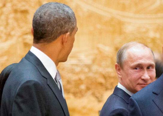 普京与奥巴马隔空对视。11月11日,在北京雁棲湖國際會議中心出席亞太經合組織第二十二次領導人非正式會議的俄罗斯总统普京与美国总统奥巴马隔空对视。