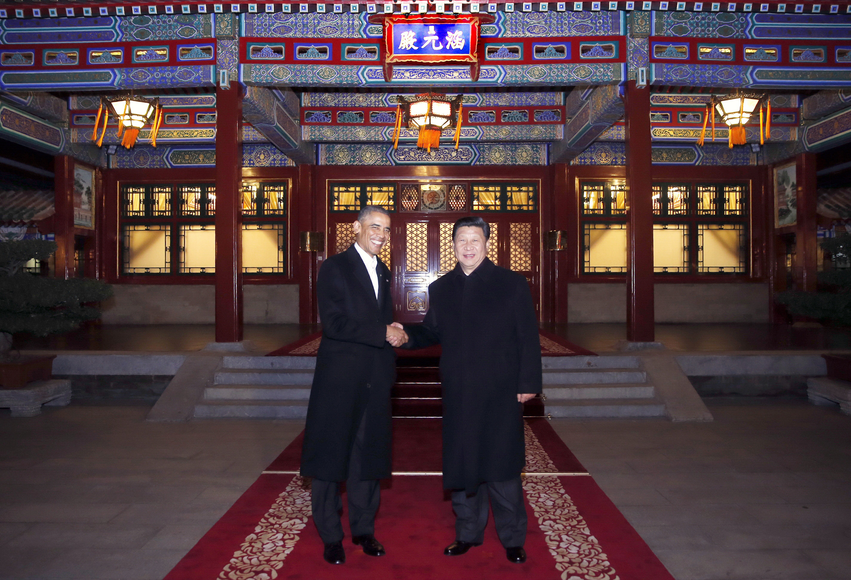 晚上的中南海,水波蕩漾,樹影婆娑。習近平在瀛臺前迎接奧巴馬,兩國元首親切握手,互致問候。習近平歡迎奧巴馬來華出席亞太經合組織領導人非正式會議并對中國進行國事訪問。習近平說,你這次訪問日程很緊。我們既安排了國事訪問的正式活動,也安排了一些輕松場合。希望你的訪問愉快,取得豐碩成果。奧巴馬表示,很高興再次對中國進行國事訪問,祝賀中國成功舉辦亞太經合組織領導人非正式會議。
