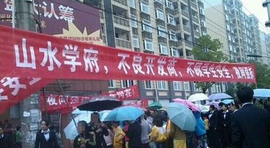 11月9日,安徽霍山縣文峰學校小學部老師領著幾十名小學生來到霍山縣山水學府售樓部拉起橫幅,期間有學生推倒了售樓部裡的沙盤和桌椅。據霍山縣教育局辦公室秦主任介紹,雙方的矛盾集中在一條有爭議的道路上,去年校方和開發商達成了一致,在新校區建成之前,這條路由學校使用。然而近日開發商因工程需要,得在這條路上建一個配電房,施工時,與學校保安發生了衝突。