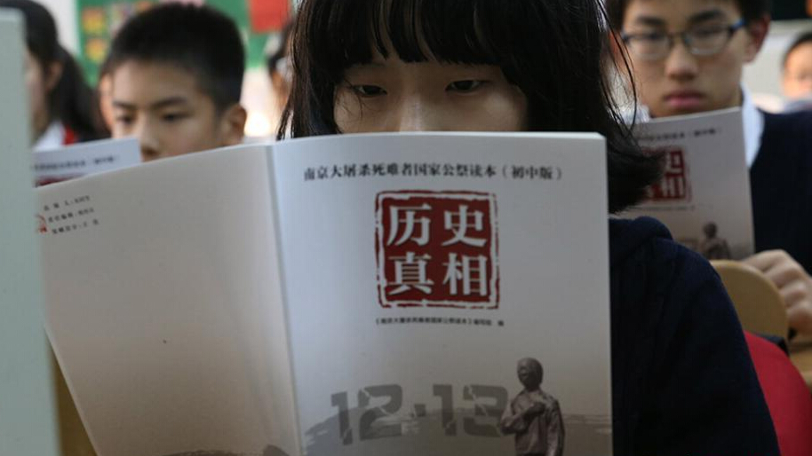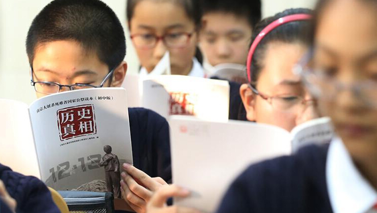 11月13日,《南京大屠殺死難者公祭讀本》(初中版)在南京外國語學校首發。圖為學生們閱讀《南京大屠殺死難者公祭讀本》(初中版)。中新社