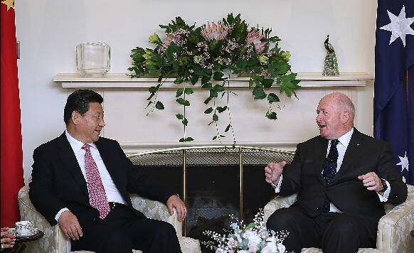 習近平表示,總督先生強調澳方把發展對華關系放在優先位置,我對此高度贊賞。我第一次訪問澳大利亞是在1988年,今天兩國合作領域之寬、程度之深是26年前難以想象的。我期待通過這次訪問,加深對澳大利亞的了解。我們決定把雙邊關系定位提升為全面戰略夥伴關系,宣布實質性結束中澳自由貿易協定談判,揭開了兩國友好合作新篇章。展望未來,中澳關系前景光明。