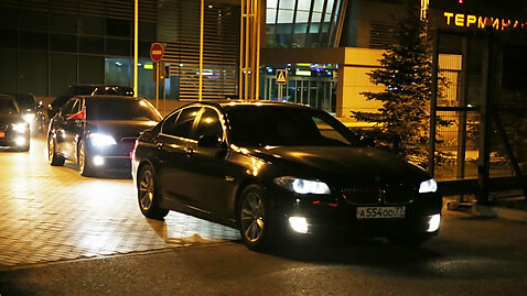 崔龙海抵达莫斯科北部机场,乘坐宝马车前往市中心。(韩联社)