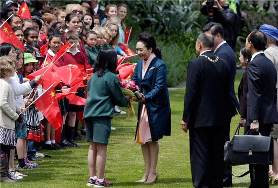 圖為新西蘭學生歡迎彭麗媛。