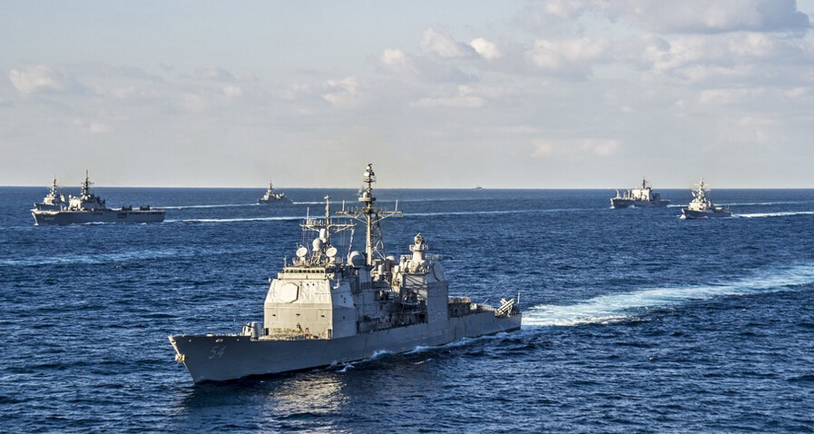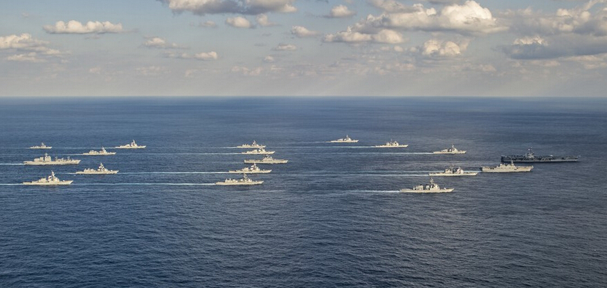 當地時間11月19日,完成“利劍”海上聯合軍事演習的美國海軍與日本海上自衛隊艦船組成航行編隊,展示武力。艦隊中包括美國海軍的華盛頓號航母和日本海上自衛隊的伊勢號直升機航母。