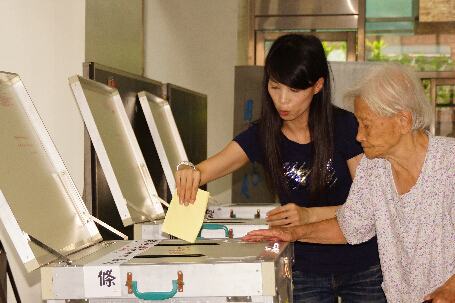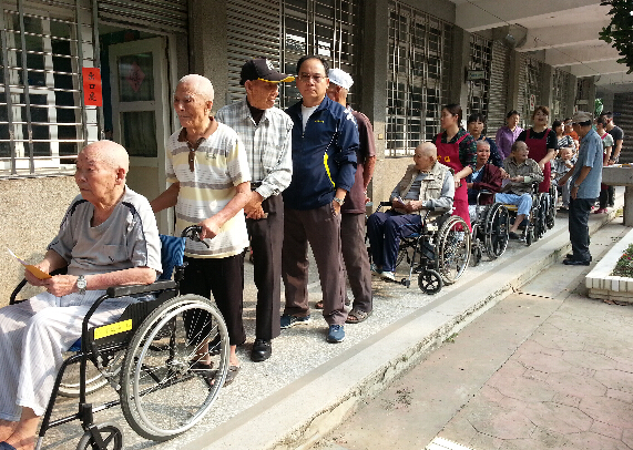 云林公職人員選舉29日投票,云林榮民之家的老伯伯們,坐輪椅也要投下一票,大家井然有序,排隊等候,至于投給誰,老伯伯神秘笑著回答「不能說」。