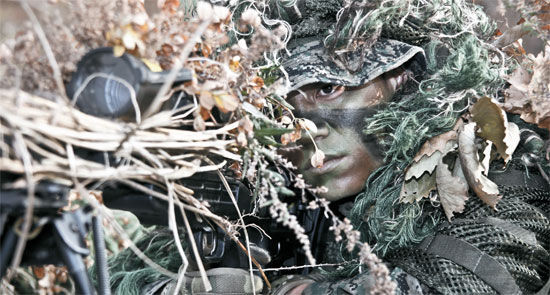 資料圖:韓國某陸軍特戰司令部狙擊手訓練場,教官身披偽裝,在樹叢中等待敵方。(圖為韓陸軍特戰司令部)