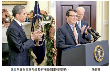 【香港商報綜合報道】在美國防長哈格爾辭職11天後,白宮終在當地時間5日宣布提名卡特出任下一任國防部長。支持者認為,作為熟悉國防部運作的「內行人」,卡特將在奧巴馬支持下獲得「呼風喚雨」的影響力,但批評者認為國家安全政策制定掌握在白宮「小圈子」手中,卡特可能淪為「橡皮圖章」。分析稱,卡特之所以被奧巴馬選中,是因其主張與奧巴馬有契合之處,如卡特認同重返亞太的重要性。
