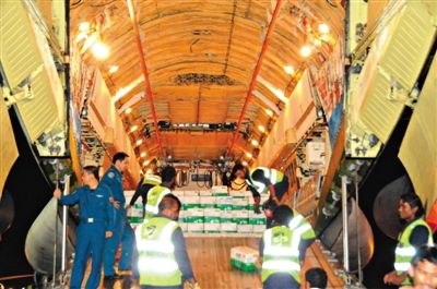 8日淩晨,中國人民解放軍兩架載有40噸礦泉水的伊爾-76飛機抵達馬爾代夫首都馬累。