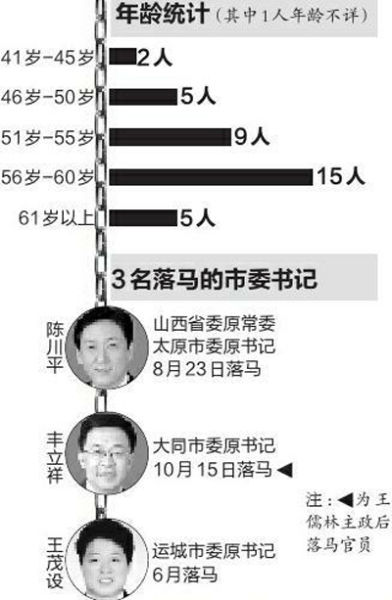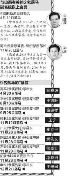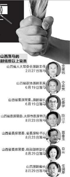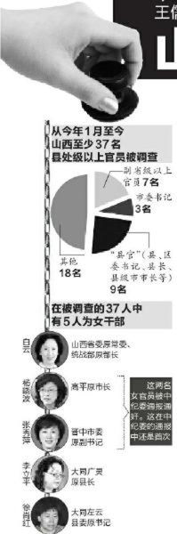 根據中紀委網站的通報和王儒林調研時透露的情況可以發現,山西今年至少有37名縣處級以上官員被調查(如果加上地方紀委通報的縣處級以下,至少有47名官員落馬),其中副省級以上官員7名、市委書記3名、“縣官”(縣、區委書記、縣長、縣級市市長等)9名,這些實權派的坍塌式腐敗,在全國都極為罕見。