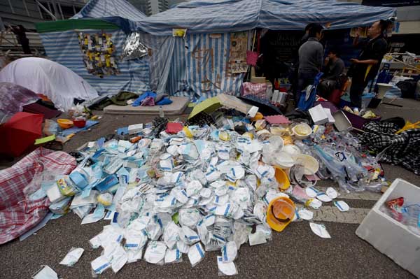 香港警方將對非法“佔領區”全面清場。12月11日清晨,香港金鐘非法“佔領區”物資散落。當日,警方將對非法“佔領區”全面清場。中新社發 張宇 攝