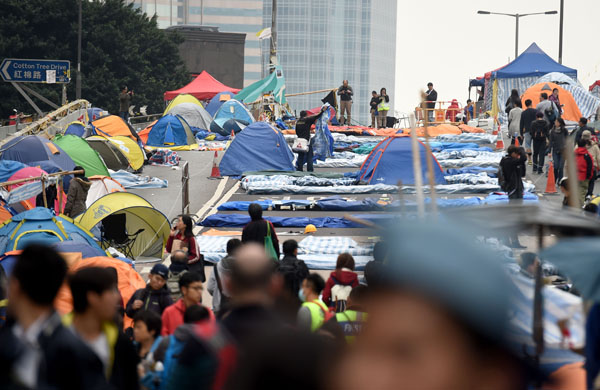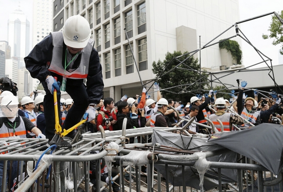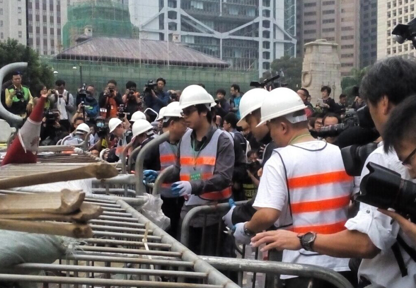 香港全面清除中環、金鐘非法“佔領區”障礙物。12月11日,香港全面清除中環、金鐘非法“佔領區”障礙物。上午9時,香港法庭執達主任開始在被示威者非法霸佔的金鐘“佔領區”宣讀禁制令,警方也將協助法庭執達主任執行禁制令,並行使其它法律賦予的權力,清除中環、金鐘一帶的障礙物,開通被堵塞的道路。隨後,警方也將在銅鑼灣一帶移除被非法霸佔路段的障礙物,開通道路。中新社發 洪少葵 攝