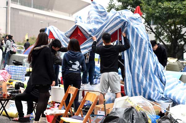香港警方將對非法“佔領區”全面清場。12月11日清晨,香港金鐘非法“佔領區”的示威者正在拆除帳篷。當日,警方將對非法“佔領區”全面清場。中新社發 張宇 攝