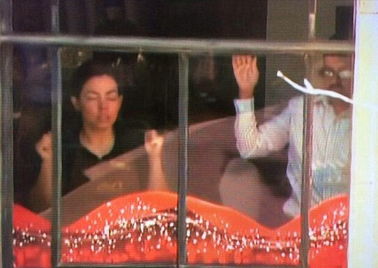 悉尼市中心現在已經遭到了警方的封鎖,Martin Place的咖啡店內被判斷至少有2名槍手,該2名男子強迫店內人質在窗戶邊舉起伊斯蘭旗幟。據稱,有多達13名人質在Lindt Chocolat咖啡店內被挾持。圖為咖啡廳內人員貼著玻璃,舉著黑旗。