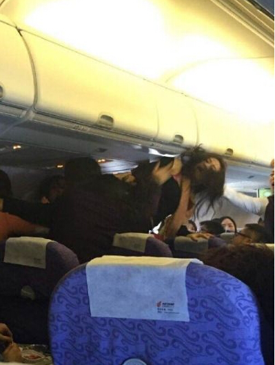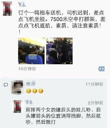 “7500米空中打群架,差點點飛機返航。”微信朋友圈中寫道,“前排兩個女的嫌后頭的娃兒吵,后頭嫌前頭的位置調得擋腳,然后就吵,然后就打”。