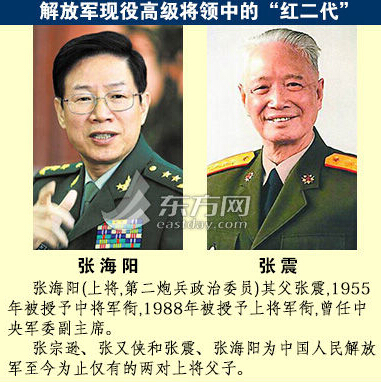 張海陽,1995年晉升少將軍銜,2003年晉升中將軍銜,2009年晉升上將軍銜。張震、張海陽是解放軍歷史上首對“上將父子”。