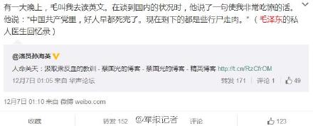 解放軍報微博稱:演員孫海英演繹的石光榮螢屏形象,給我們留下革命年代的美好記憶。但是閱讀他的微博,我們看到生活中的孫海英忙著誦讀聖經做禮拜,更令人驚愕的是他對毛澤東等革命先輩的不敬[怒]中國公民有宗教信仰自由,但是基督教信徒能演好優秀共產黨人形象嗎?