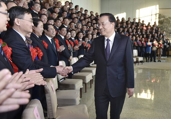 李克強與全國審計機關先進集體和先進工作者代表握手。