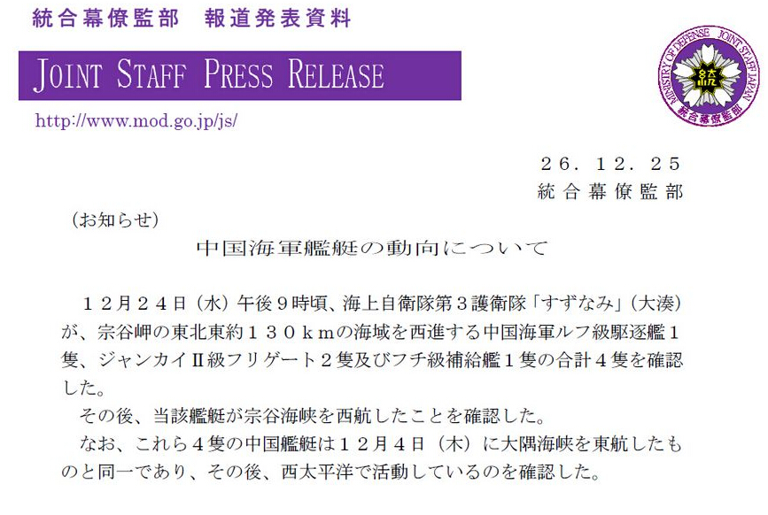 日本防衛省統合幕僚監部25日發布消息稱,發現中國海軍的驅逐艦等4艘艦船當地時間25日凌晨2點左右穿過宗谷海峽向西航行。中國北海艦隊以112哈爾濱號驅逐艦和兩艘054A護衛艦等4艦為核心的編隊從西太平洋方向進入日本海。從日方的消息和照片看,在中方艦艇接受889太湖號海上補給時,遭遇日本高波級驅逐艦涼波號抵近監視。