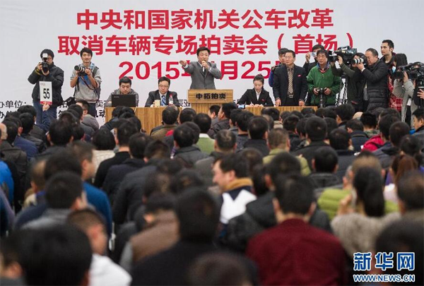 1月25日,中央和國家機關公車改革取消車輛首場拍賣會在北京中拓國際拍賣有限公司舉行。據悉,首批中央和國家機關公車改革取消車輛拍賣共涉及300餘輛公車,分三次進行拍賣。1月25日在北京中拓國際拍賣有限公司舉行首場拍賣後,北京北汽鵬龍機動車拍賣有限公司和北京花鄉拍賣有限公司的拍賣將分別在1月26日和2月1日進行。