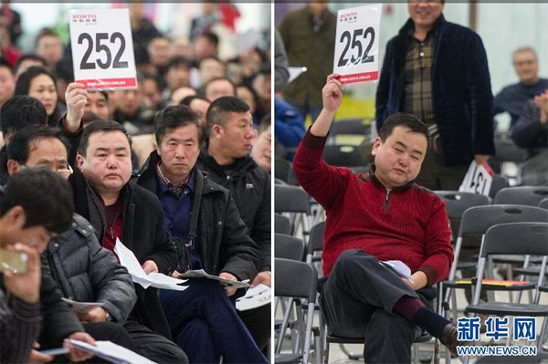 1月25日,252號競拍者舉牌拍得當天公車拍賣的第一輛車(左圖)和最後一輛車(右圖)。當日,中央和國家機關公車改革取消車輛首場拍賣會在北京舉行,106輛公車全部拍出。“首、末”兩車均被252號競拍者拍得。