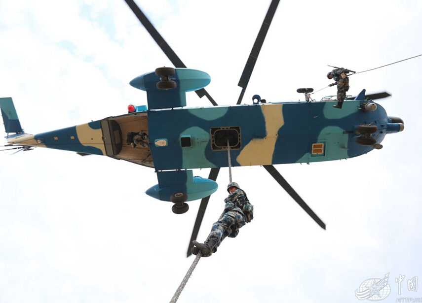 在清除“敵”地面防空火力點后,運輸直升機在武裝直升機掩護下,降低飛行高度,特戰隊員以迅雷不及掩耳之勢,在機腹、側門和尾門甩下繩索進行索降。著陸后,他們立即展開戰斗隊形,對“敵”目標發起突擊。
