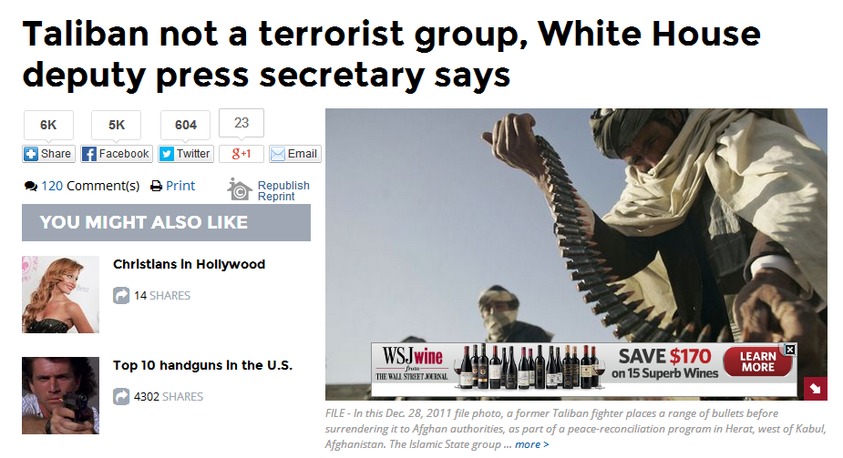 1月29日美國白宮例行記者會,發言人喬希·歐尼斯特表態稱塔利班和恐怖組織伊斯蘭國的分類不同