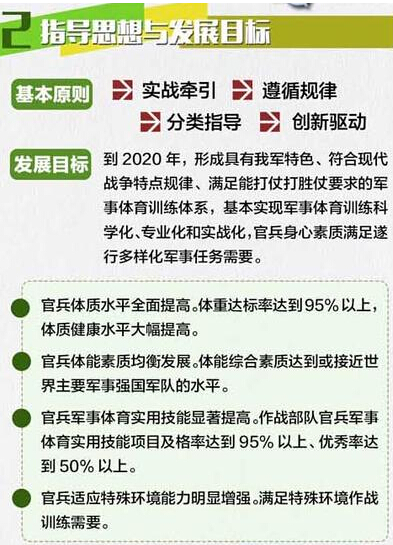 总参谋部、总政治部、总后勤部、总装备部近日联合颁发《军事体育训练改革发展纲要(2015-2020年)》(以下简称《纲要》),系统提出推进军事体育训练改革发展的指导思想、发展目标、主要任务和相关政策。《纲要》指出,军事体育训练是提高官兵身体和心理素质的基本途径,是培育意志品质和战斗作风的有效手段,是促进人与武器装备有机结合、增强战斗技能的重要环节。要准确把握军事体育训练改革发展的指导思想与目标原则,坚持实战牵引,坚持遵循规律,坚持分类指导,坚持创新驱动,形成具有我军特色、符合现代战争特点规律、满足能打仗打胜仗要求的军事体育训练体系。