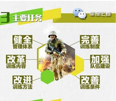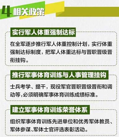 《纲要》明确了推进军事体育训练改革发展的主要任务,强调从健全管理体系、改革训练内容、改进训练方法、完善训练制度、加强队伍建设、改善训练条件等方面聚焦用力,提高部队军事体育训练水平。为调动广大官兵参加军事体育训练积极性,《纲要》提出实行军人体重强制达标、推行军事体育训练与人事管理挂钩、建立军事体育训练荣誉体系等配套政策。