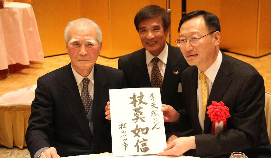 2月28日,日本前首相村山富市在2015年大分日中友好交流會上向中國駐福岡總領事李天然(右)題贈“杖莫如信”四字。