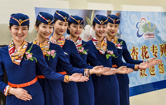 3月21日,乌鲁木齐客运段动车队的“动姐”在吐鲁番北站欢迎乘坐“高铁杏花专列”的游客。