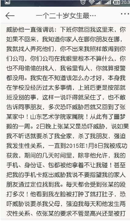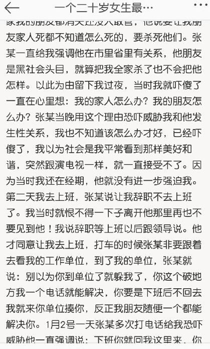 小孙(化名),一个二十岁的济南女子,被一大学老师张某以招聘兼职为名骗至家中,遭非法拘禁七天七夜。在这黑暗的七天里,张某实施了多次强奸,并把刀架在女子脖,以死亡相威胁,并强行拍下了她的裸照。视频是济南电视台都市新女报对此案的报道,下图则是女孩对这一事件的描述。