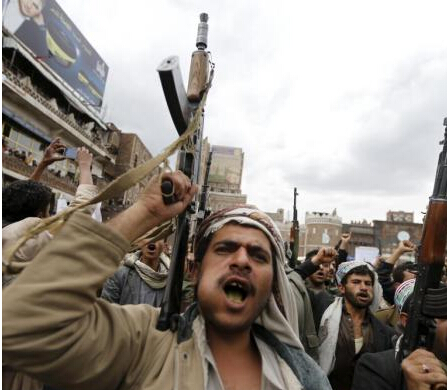 當地時間2015年3月26日,也門薩那,胡塞反政府武裝分子持槍參加集會,高喊反沙特的口號。