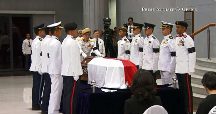 李光耀靈柩蓋上新加坡國旗,再將由八名來自海陸空三軍和警隊的扶靈軍官,移送上拖曳炮架,移送離開國會大樓。