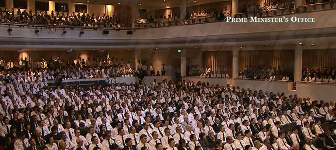 會場內許多各國政要并肩而坐,個個神情肅穆。包括總理李顯龍在內,將會有10人宣讀悼詞。