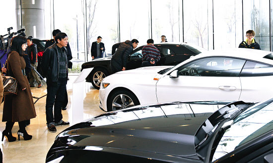 上海自貿區平行進口汽車已試運行。圖為2月15日,市民在上海自貿區平行進口汽車展示交易中心參觀