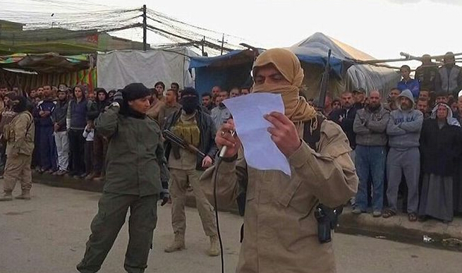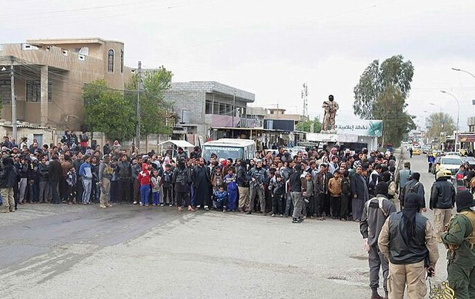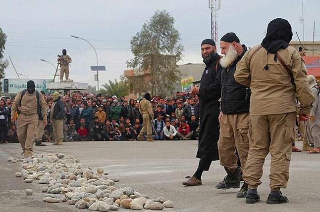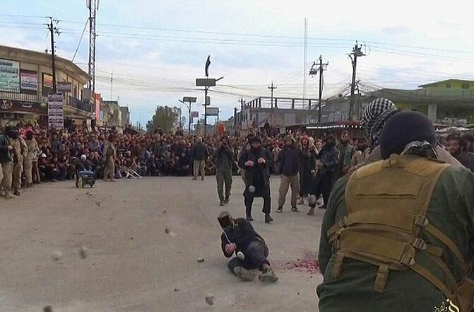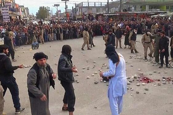 事发在摩苏尔,一对情侣被IS指控有婚前性行为,两人被绑起蒙眼押到街头行刑。大批群众围观整个过程,男女老嫩皆有。
