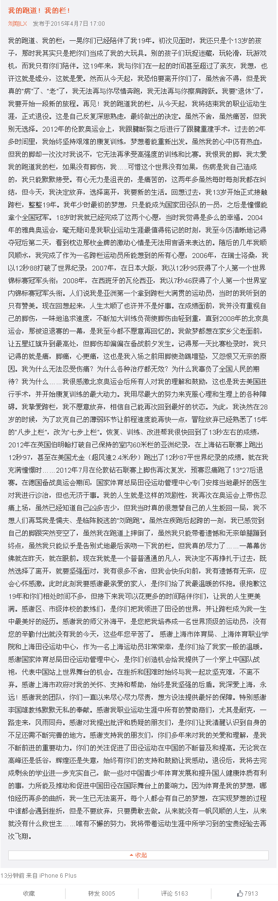 新浪體育訊 北京時間4月7日下午,劉翔在新浪微博發佈長微博,正式宣佈退役。