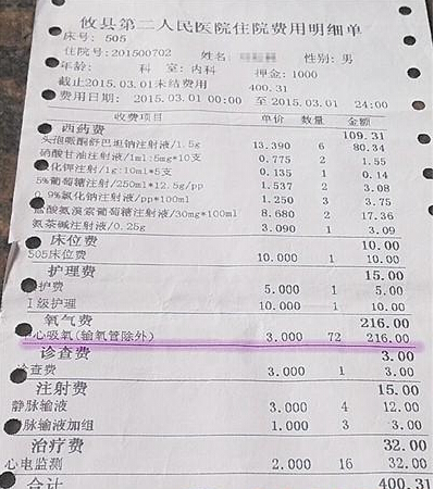 記者在劉強提供的其父親3月1日醫院住院費用明細單上看到,“氧氣費(輸氧管除外)”一項為72小時,以單價3元來計算,當天的吸氧費用是216元。3月2日-6日的住院費用明細單上,“氧氣費”一項均為72小時,費用均為216元。